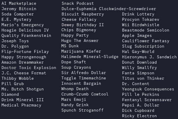 A very broad category! Again, mostly because they're usually really funny and wacky, but you can imagine these as people coming up with false cover names and just using whatever came to mind first if you'd like.